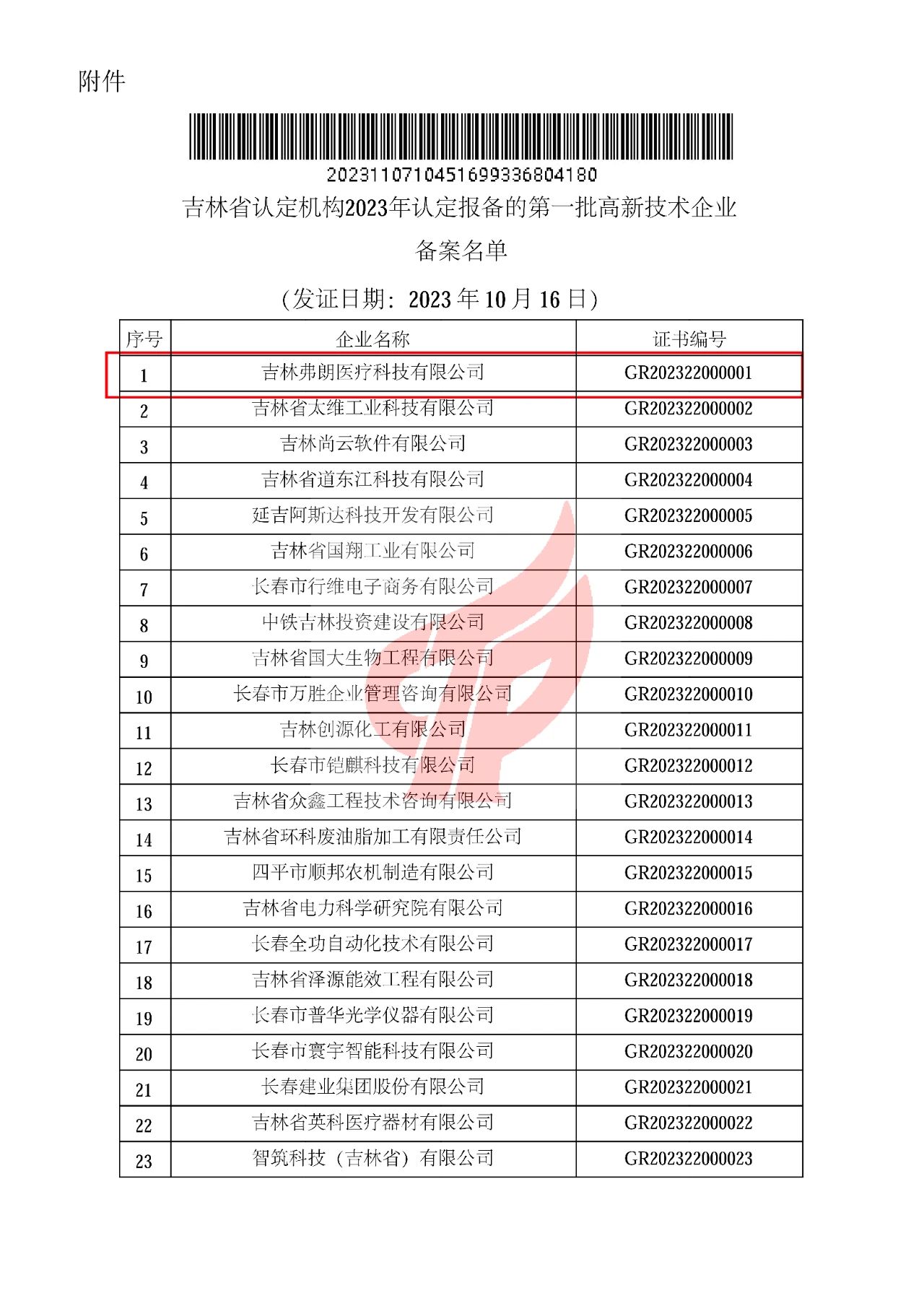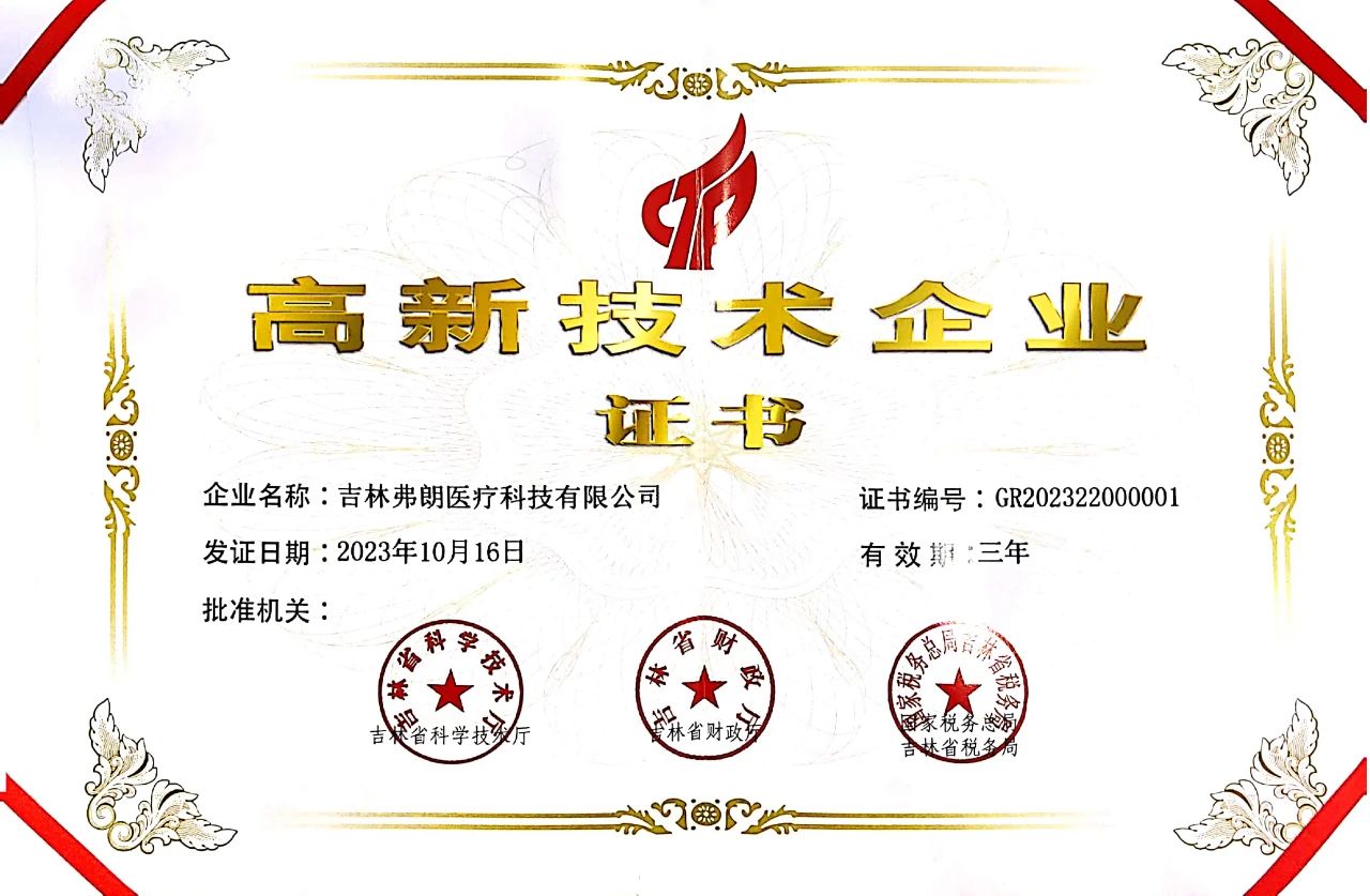 近(jin)日,根據《高新(xin)技(ji)術企業(ye)認(ren)定(ding)管(guan)理(li)辦法》 (國(guo)科發(fa)火 (2016)32號(hao)(hao))和《高新(xin)技(ji)術企業(ye)認(ren)定(ding)管(guan)理(li)工作指引》(國(guo)科發(fa)火 (2016) 195號(hao)(hao))有關規定(ding),經公(gong)司申報(bao)、地方初(chu)審、專家審查(cha)等嚴格的評(ping)審程序,吉(ji)林弗朗醫療科技(ji)有限公(gong)司成功領取(qu)“高新(xin)技(ji)術企業(ye)”證(zheng)書。