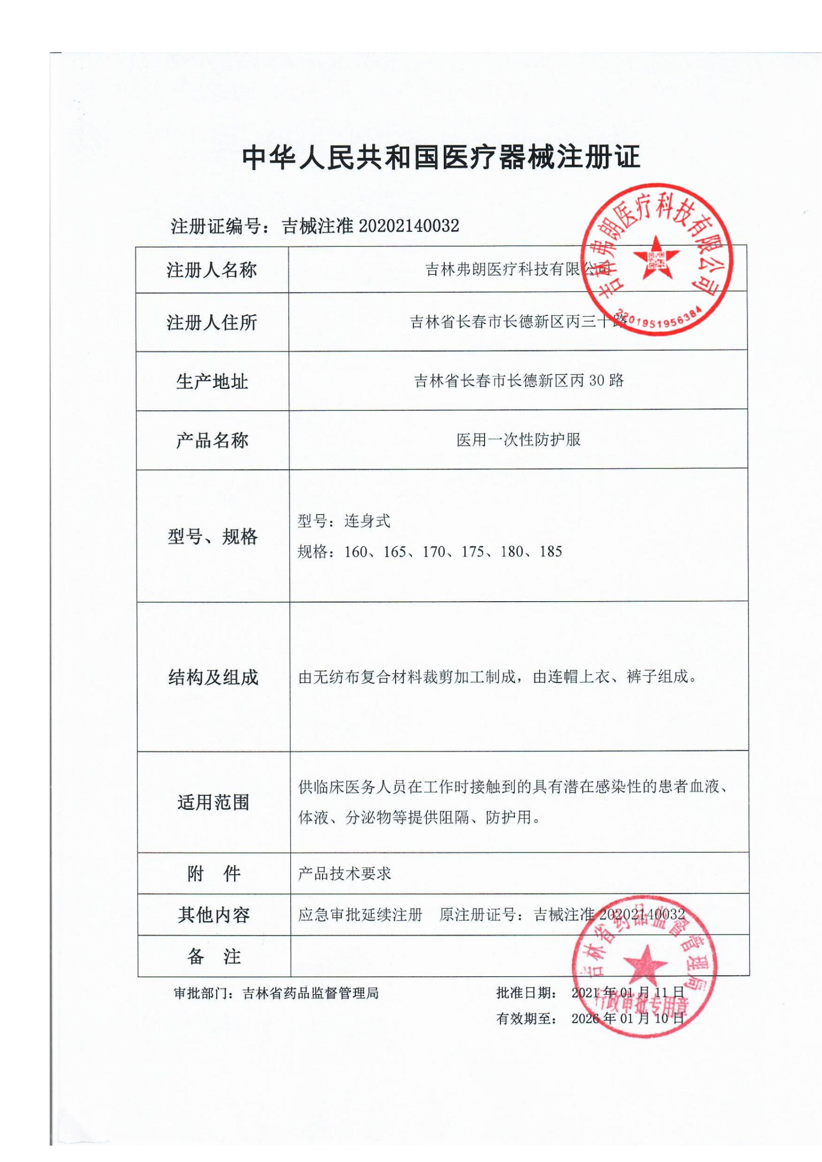 2.其他性能詳(xiang)見吉林弗朗醫(yi)療科技(ji)有限公司《醫(yi)用一次(ci)性防(fang)護服產品技(ji)術要求》。